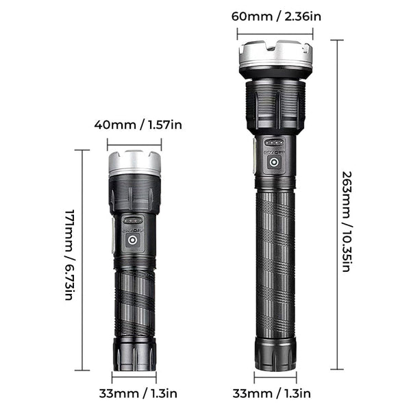 • La lampe de poche est une LED XHP90 super lumineuse intégrée à haute luminosité, la puissance maximale est de 6 000 lumens, 8 000 000 de lumière du soleil illuminent environ la longueur de deux terrains de football, atteignant près de 1640 pieds.